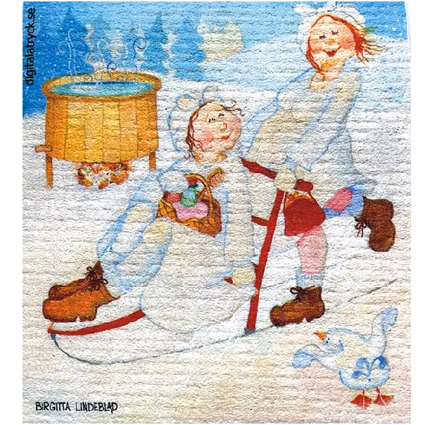 Svensktillverkad disktrasa i bomull/cellulosa som är komposterbar med motivet "Vinterspa" av Birgitta Lindeblad.
